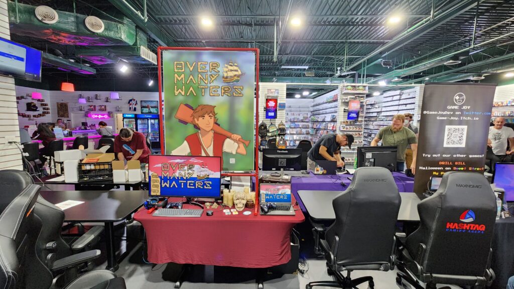 Last Saturday, October 28th 2023, I showcased Over Many Waters at the Hashtag Gaming Arena in Herndon, Virginia. From 4PM to 9PM I had new players sit and test the game, for better or worse. These events are crucial to get live feedback and opinions from the perfect strangers. Most of the time, these strangers are honest and willing to lend the feedback needed for the growth of an indie game like mine.